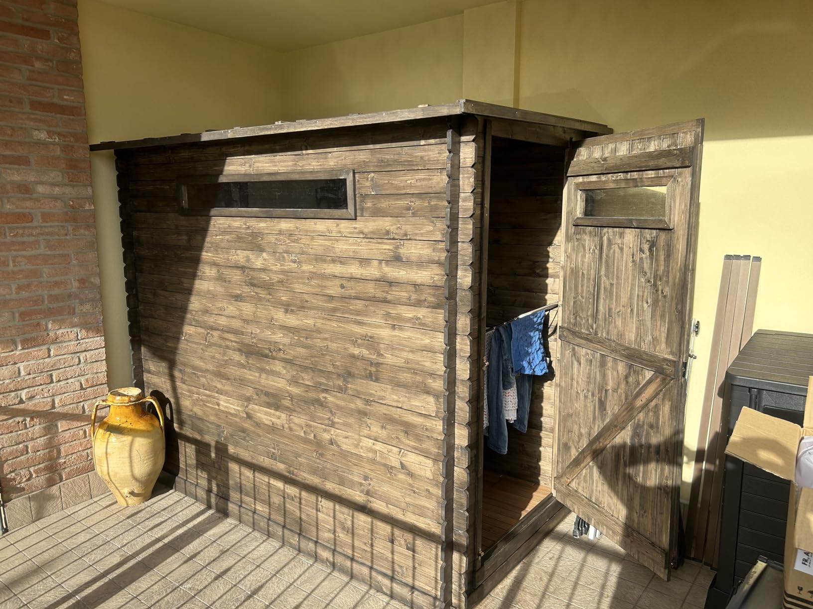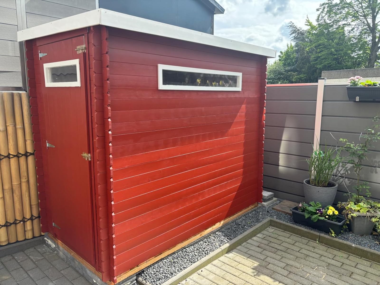 Robust wooden garden shed: the structure of the house is based on the principle of interlocking boards, which takes a little longer to assemble, but gives the garden house more strength and durability. Assembling a new shed will be a real pleasure for any DIY enthusiast. Thanks to the wide doors, you can easily place larger items inside the cabin, and the plexiglass windows provide natural daylight.