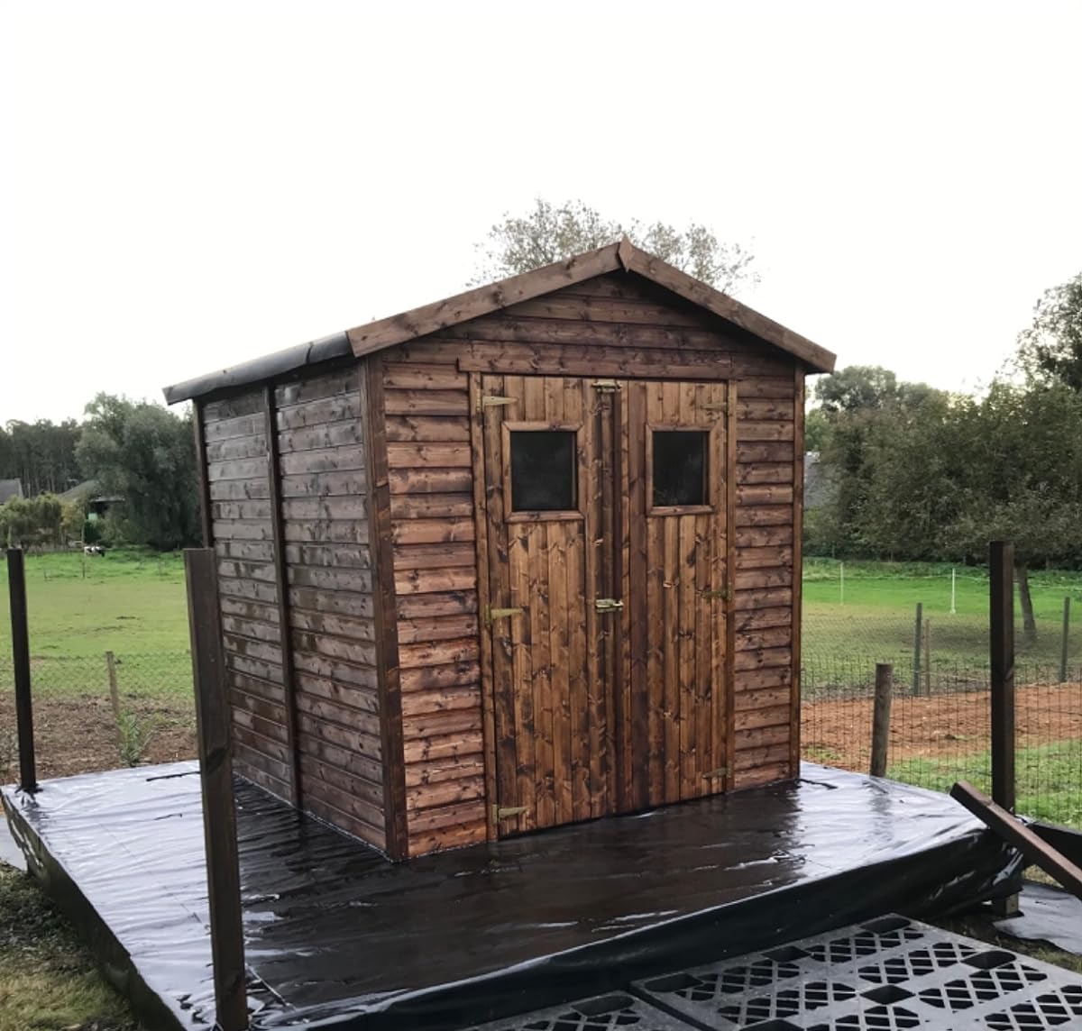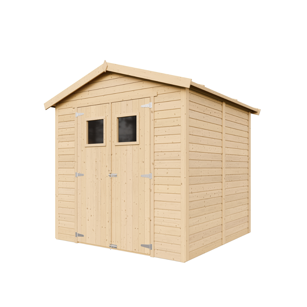 Estrutura resistente: o abrigo é montado facilmente a partir de painéis pré-fabricados com tábuas de madeira de 17 mm de espessura. Pode ser instalado junto a uma vedação ou numa área aberta do jardim.