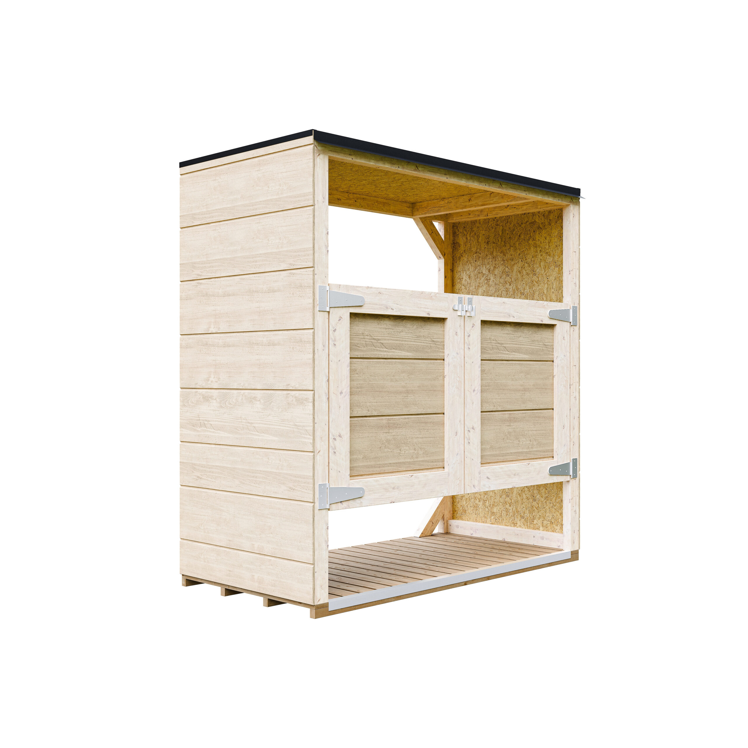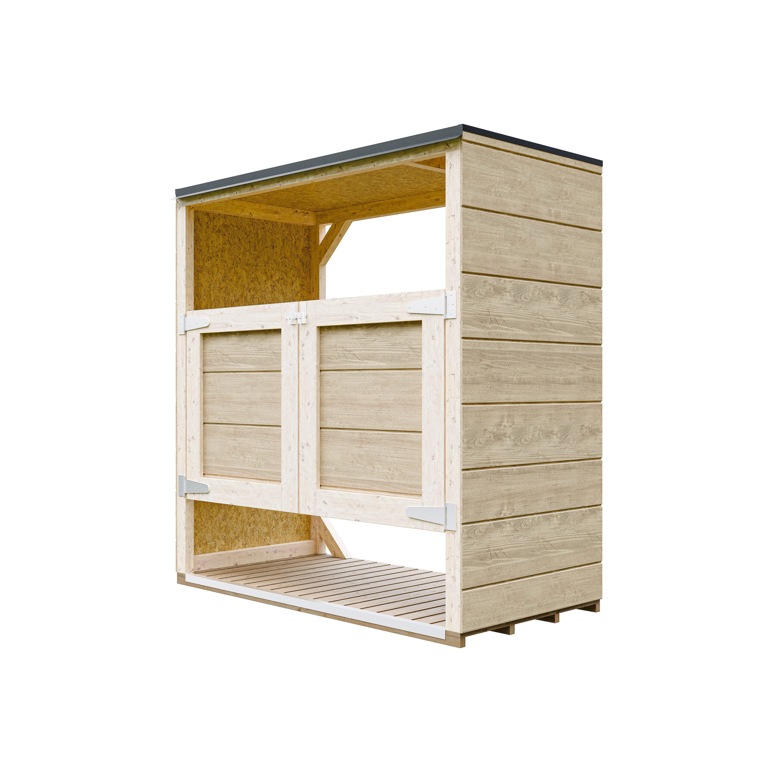 O telhado é feito de painéis OSB-3 de 12 mm com revestimento betuminoso impermeável, proporcionando proteção eficaz contra a chuva. As bordas metálicas e o ligeiro beiral ajudam a direcionar a água de forma eficiente.