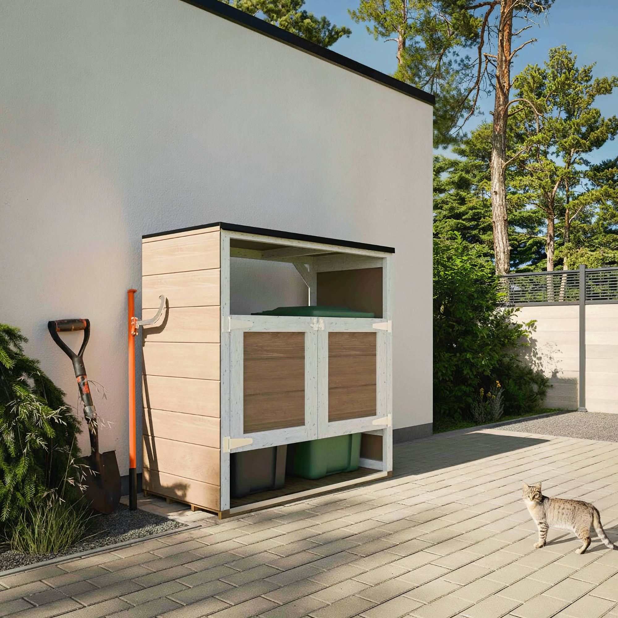 Projetada como um prático abrigo para contentores lixo, possui portas frontais que permitem fácil acesso, mantendo os contentores ocultos e garantindo um aspeto limpo e organizado. O design minimalista adapta-se perfeitamente a qualquer jardim, entrada ou pátio.