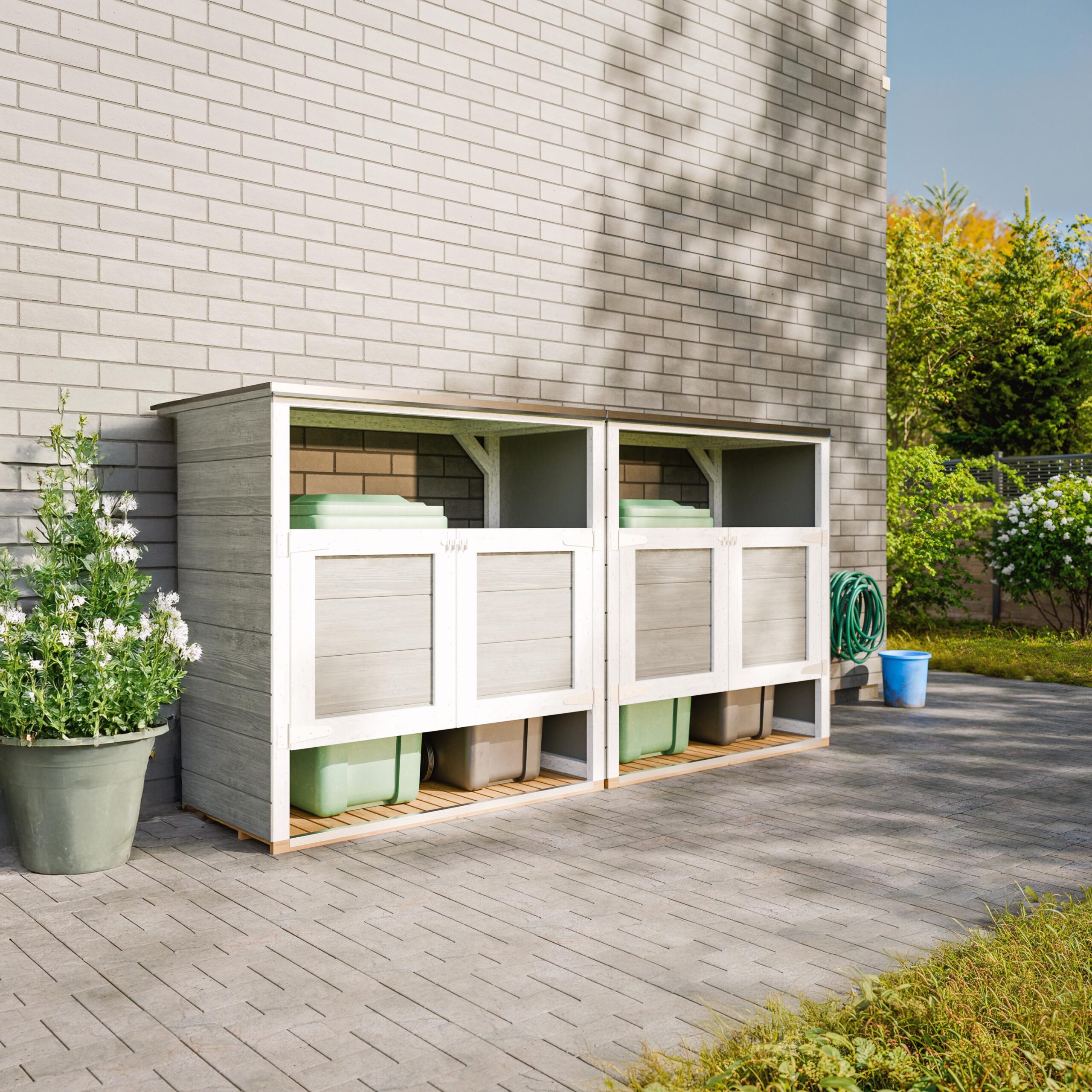 Esta solução não serve apenas como abrigo para contentores lixo, mas também como armário exterior jardim ou caixa de arrumação exterior para ferramentas e acessórios.