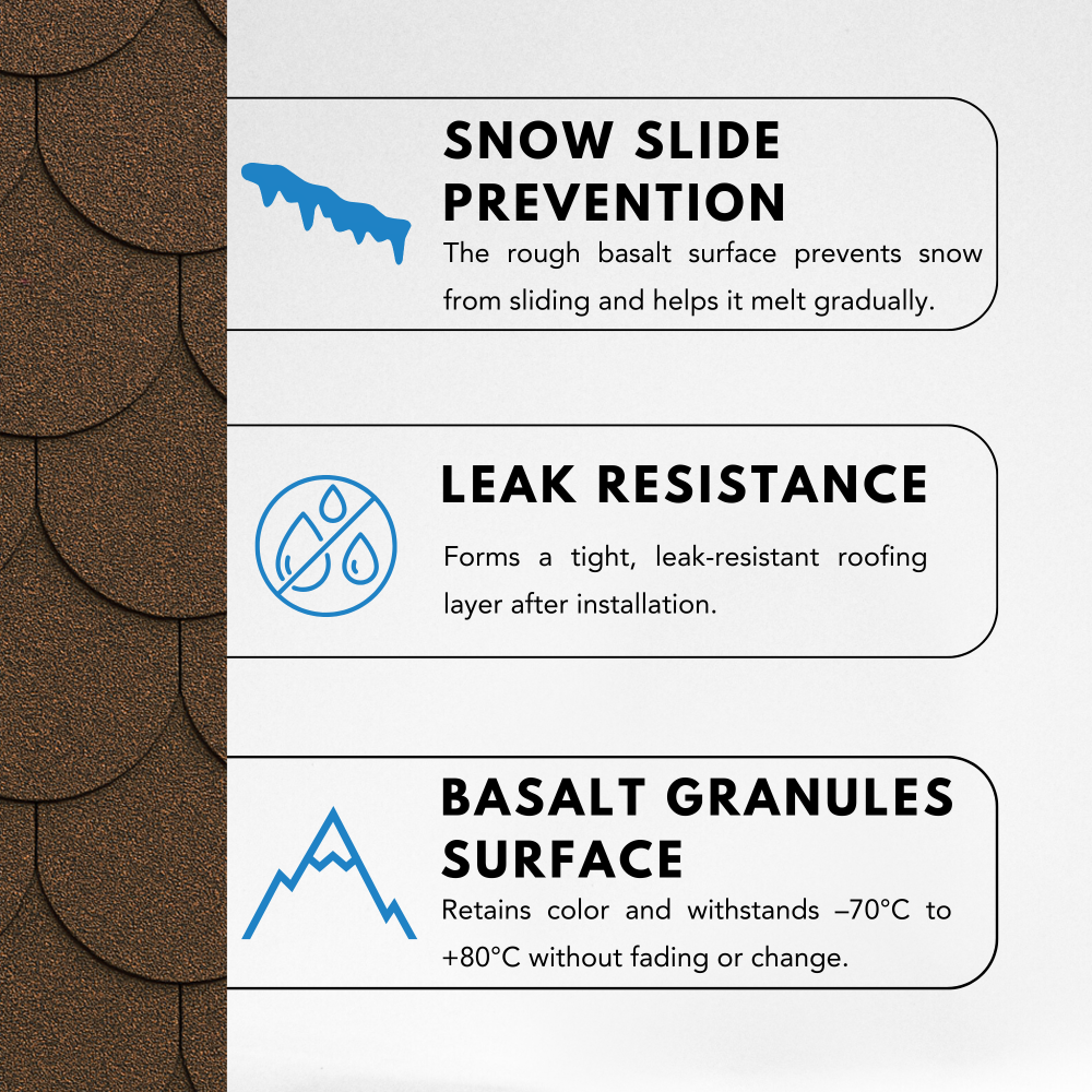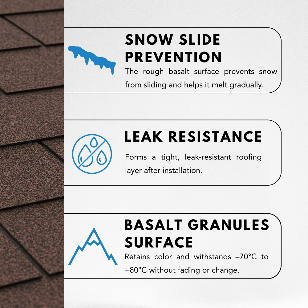 Resistência às intempéries: as telhas betuminosas mantêm a cor mesmo com exposição solar prolongada e são altamente resistentes aos efeitos ambientais agressivos. Não sofrem corrosão nem apodrecimento, sendo adequadas para todas as zonas climáticas — desde climas muito frios até os mais quentes.