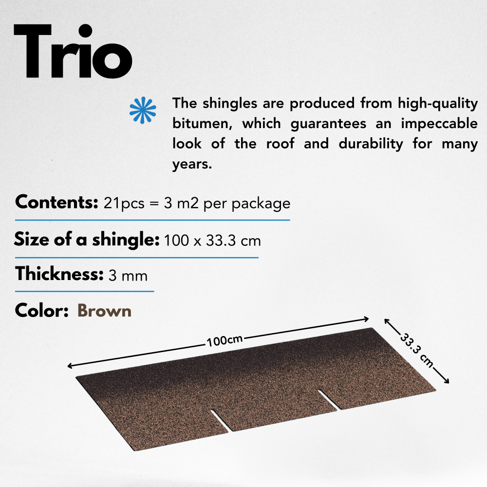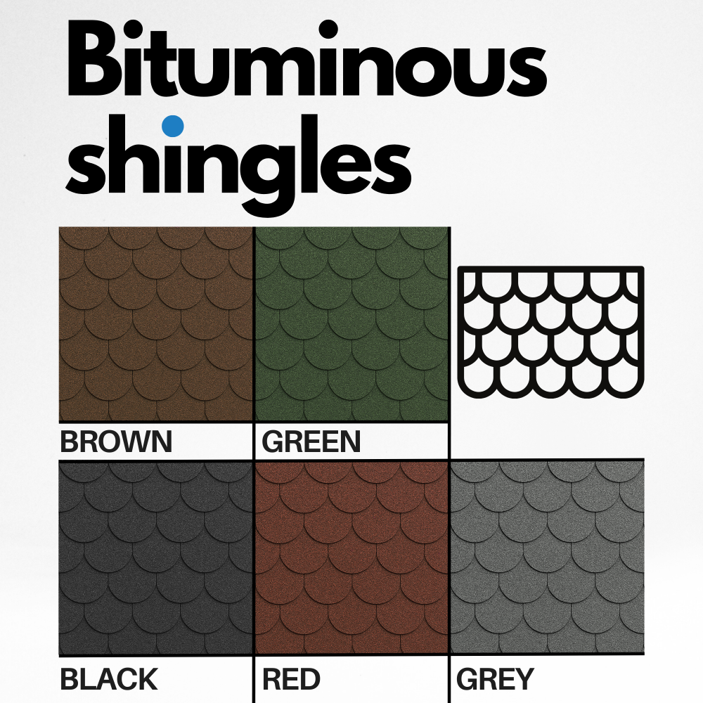 Opções de cor: disponível em cinco cores – preto, vermelho, verde, cinzento e castanho. Este conjunto de telhas é destinado à casa de jardim modelo M101 e inclui telhas suficientes para revestir todo o telhado, peças de cumeeira e pregos.